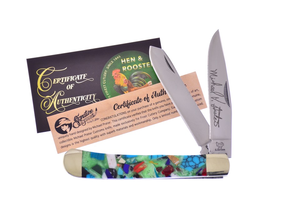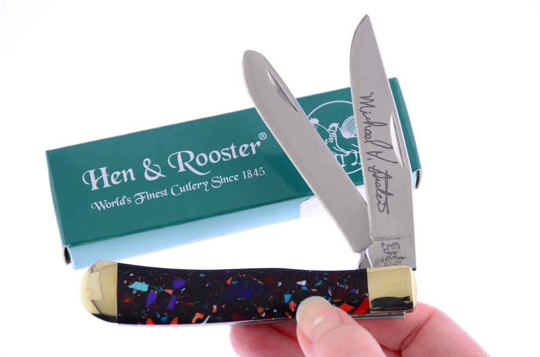 Hen & Rooster fans are going to love this 4 1/8" End of Day Stone Trapper! It has Custom Handle and Etched Blade and, no one can resist, so get yours while you can!