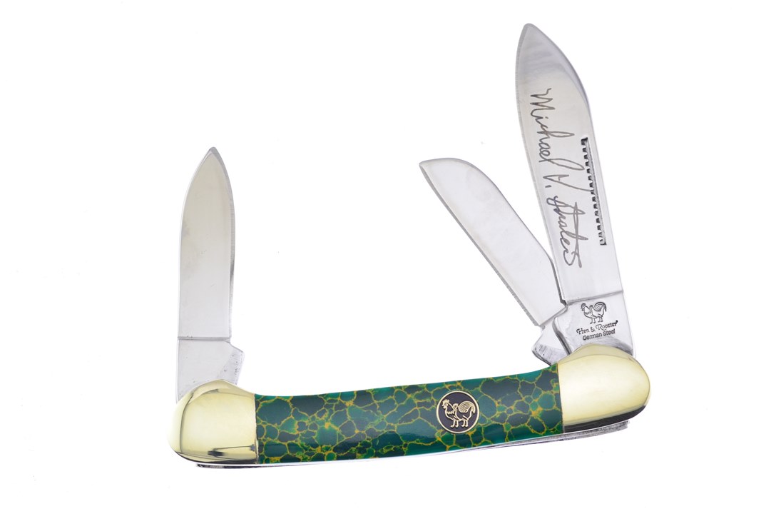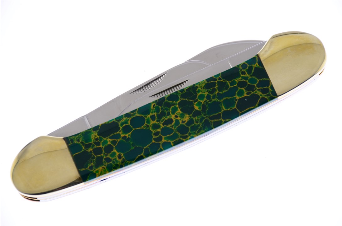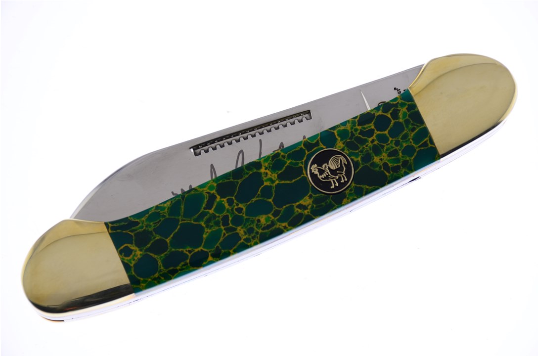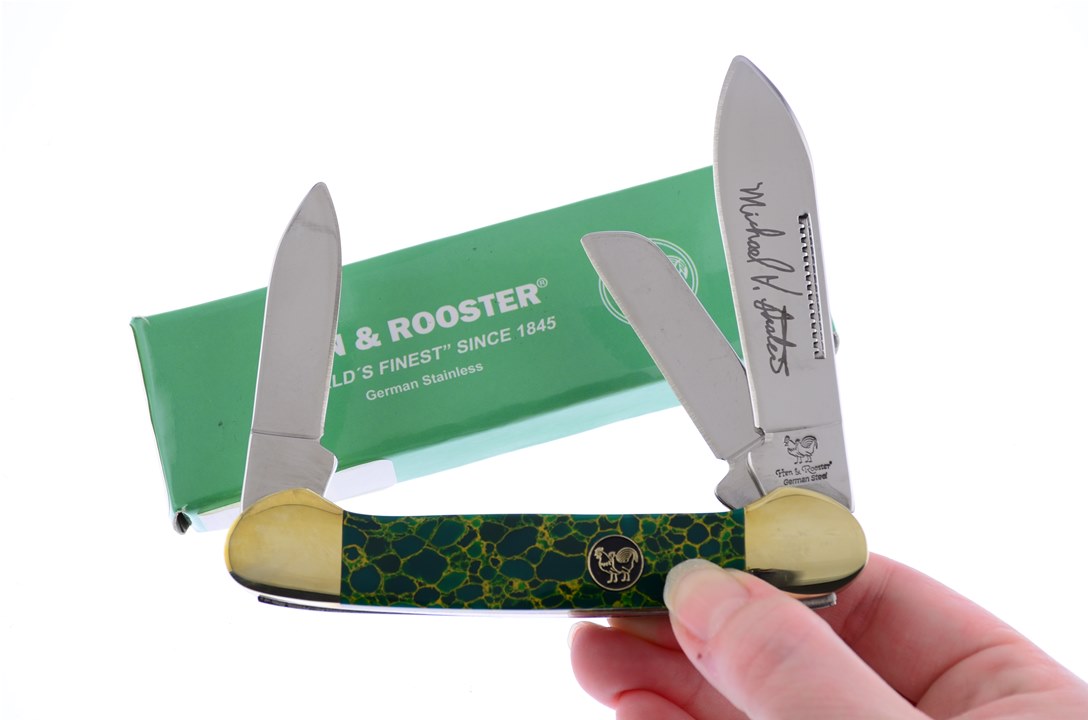 This 4 1/2" Golden Jade Custom Gunboat is another great piece from Hen & Rooster. It has Custom Handle and Etched Blade and, this item is going to sell like hotcakes, so get yours now.